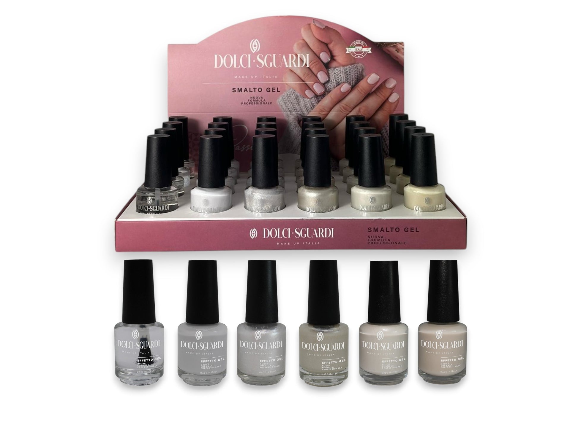The "Silver Elegance" kit by Dolci Sguardi is a collection of 24 15ml gel-effect nail polishes in sophisticated shades such as silver, pearl grey, champagne and pearly nude. Perfect for a refined and elegant manicure, this set is ideal for those who love bright and chic nails. The gel-effect formula, Made in Italy, guarantees a smooth application, an ultra-bright finish and long-lasting. Ideal for those who want a glamorous and timeless look.