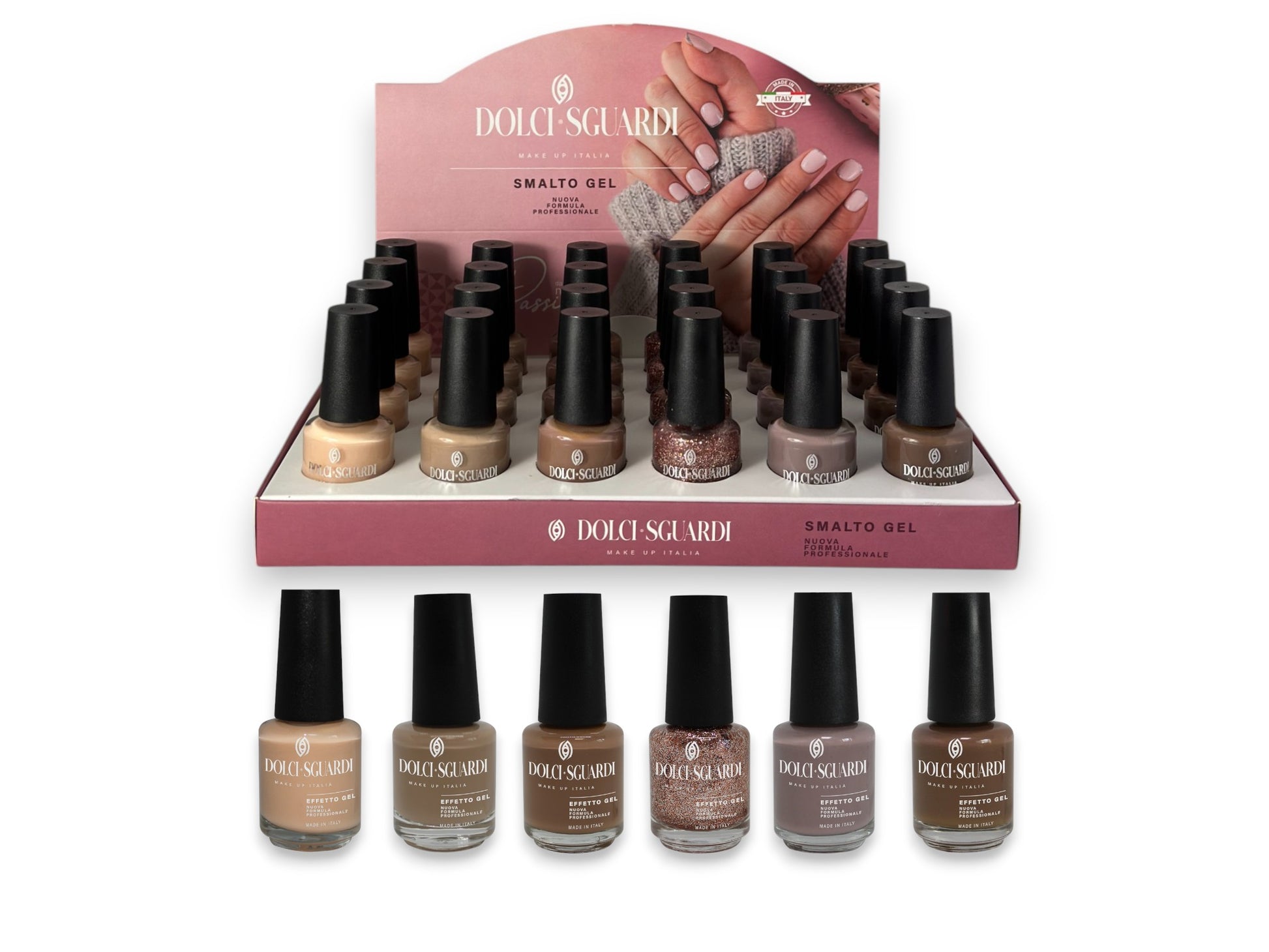 The "Dolci Sguardi - Collezione Nude Gel Chic" kit is a professional set of 24 gel-effect nail polishes in 15ml format, ideal for those who want elegant and flawless nails. The selection of neutral colors, from beige to brown, with both creamy and glittery finishes, allows you to create refined and versatile looks. The gel-effect formula ensures extreme shine and long-lasting, offering a professional result without the need for a UV lamp. Made in Italy, synonymous with quality and style.