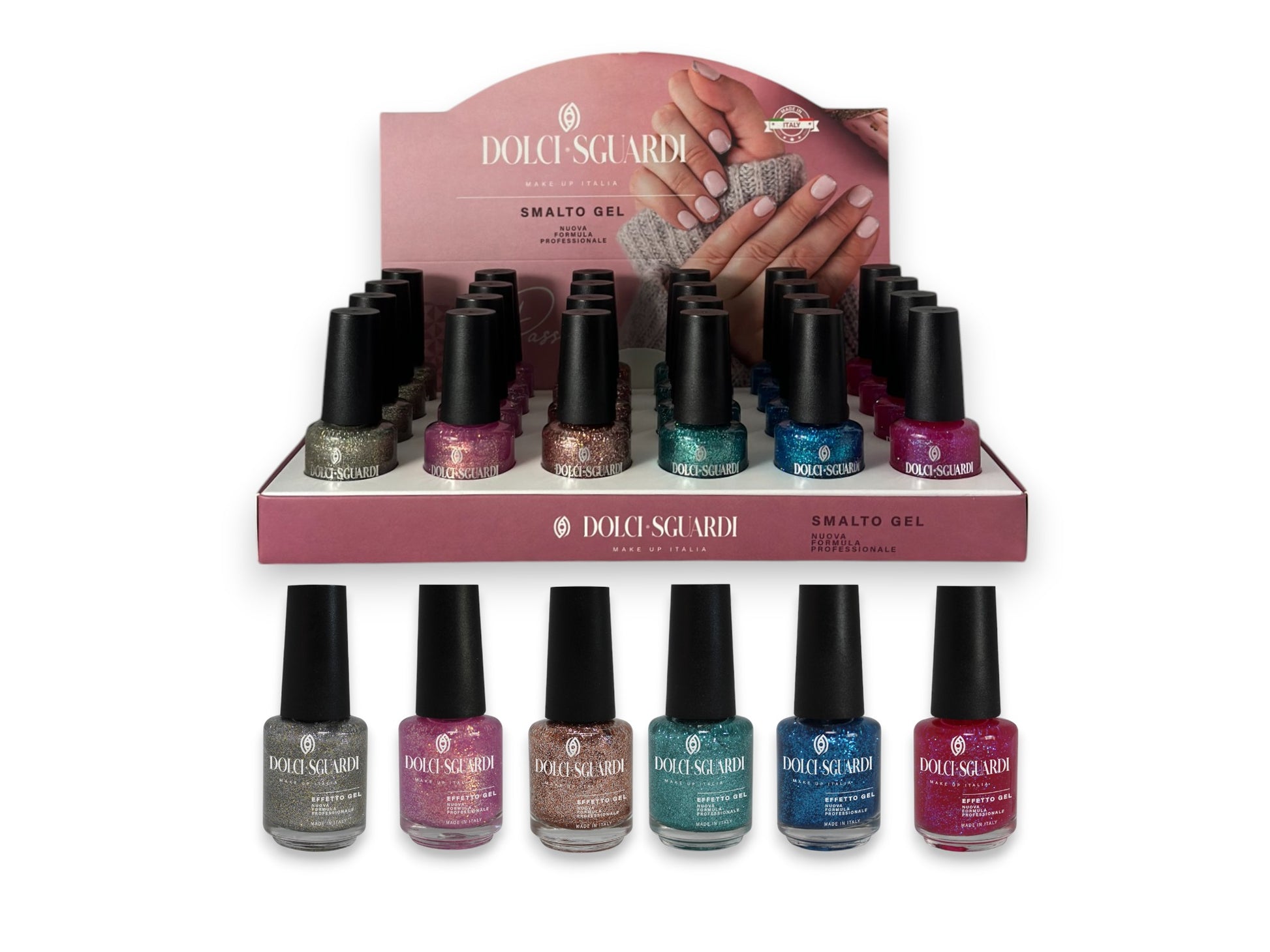 The "Dolci Sguardi - Collezione Glam Spark" kit is a professional set of 24 gel-effect nail polishes in 15ml format, perfect for those who love bright and brilliant colors. The selection of intense shades, including shades of silver, pink, bronze, turquoise and blue, is enriched with refined glitter reflections for a bright and sophisticated look. The gel-effect formula guarantees extreme brilliance and long-lasting, without the need for a UV lamp. Made in Italy, synonymous with quality and style.