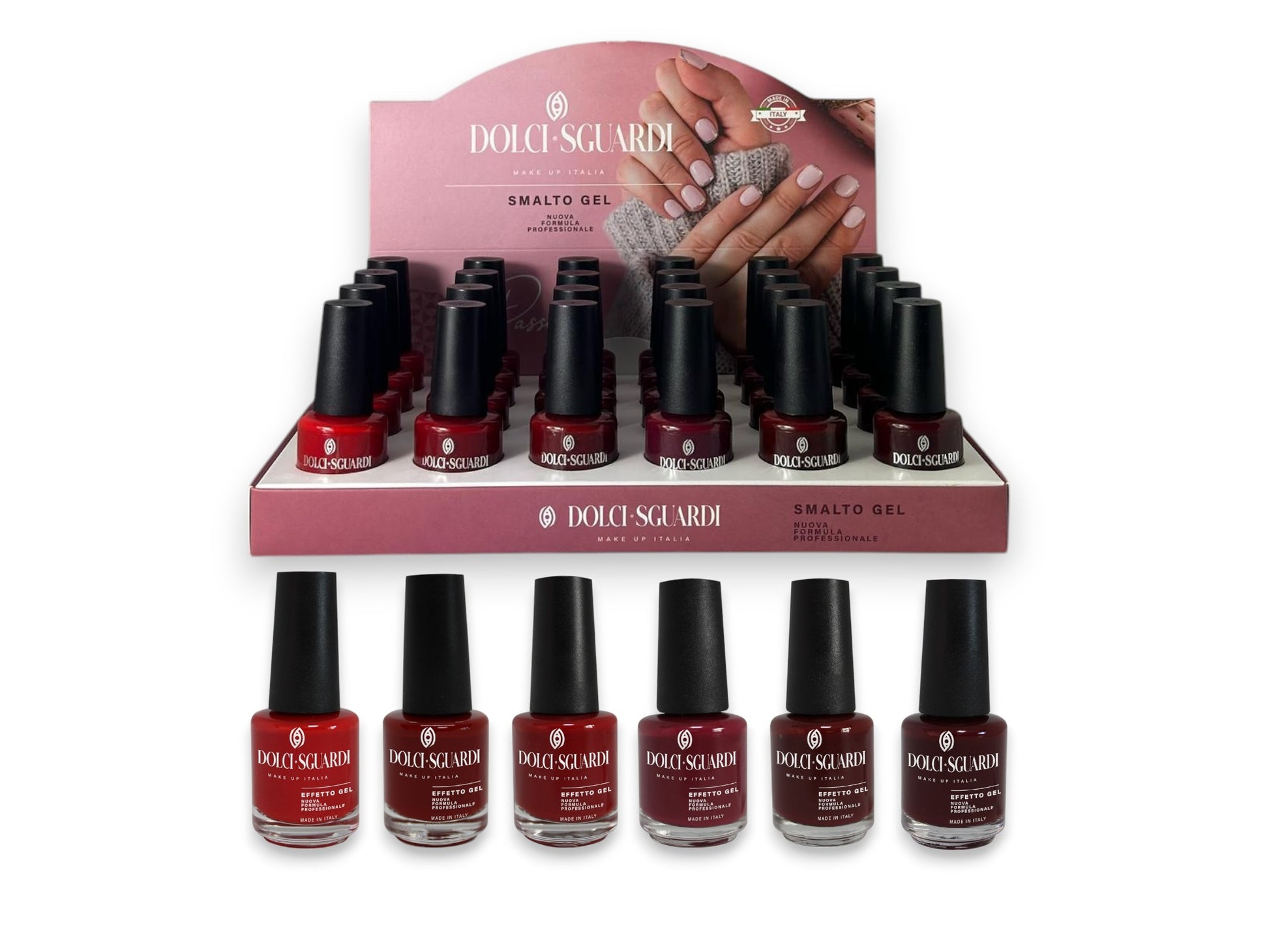 The "Dark Elegance" kit by Dolci Sguardi presents a refined selection of 24 15ml gel-effect nail polishes, with intense and sophisticated shades such as ruby red, deep burgundy and cherry black. Perfect for those who love an elegant and seductive look, this set offers an ultra-bright finish and long-lasting wear. The professional Made in Italy formula guarantees uniform application and a flawless effect for days. Ideal for refined and high-impact manicures.